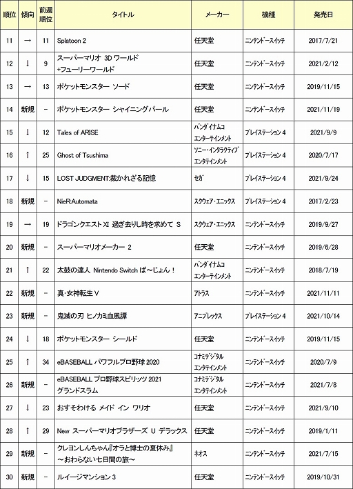 先週に引き続き、Switch ソフトが上位を占めるなど、落ち着いたランキングとなっています。新規では、7 位にPS4 版