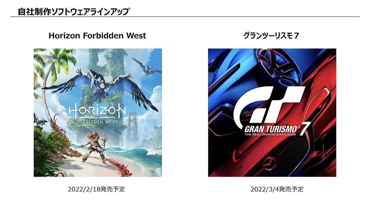 また十時氏は、自社制作ソフトウェア「Horizon Forbidden West」(2022年2月18日発売予定)や、「グランツーリスモ7」(2022年3月4日発売予定)に加え、自社制作以外でも大型タイトルの発売が下半期に予定されているとアピール。さまざまなゲームを楽しんでもらうことで、ユーザーエンゲージメントがさらに高まることに期待を寄せた。